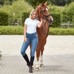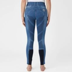 The B Vertigo Dianne breeches are made from soft, water and dirt repellent denim material. The high waist keeps them in place, and the silicone full seat keeps you in the saddle. Belt loops, 3 button closure and contrasting seams around pockets and belt loops add to the typical jeans look. Breathable fabric keeps you cool while riding or in the stables. Subtle B Vertigo embroidery adds a chic detail.