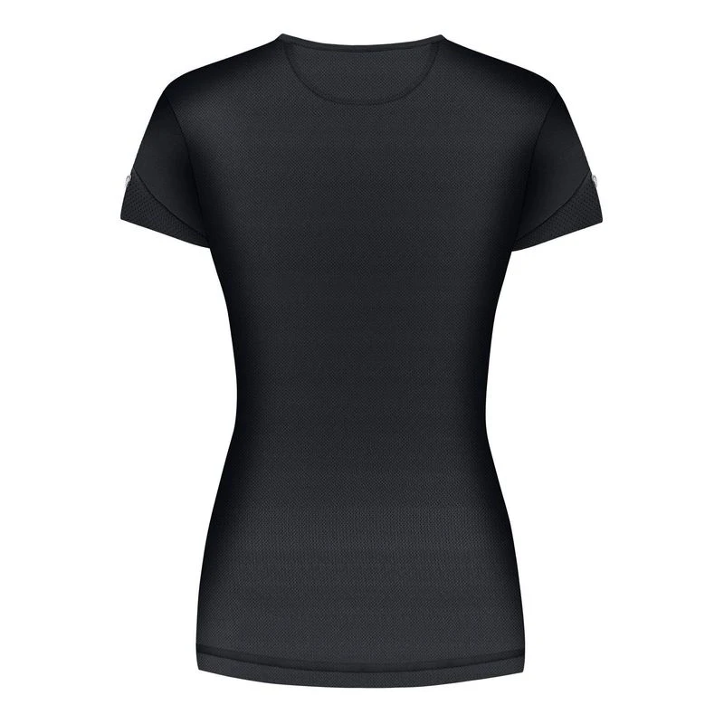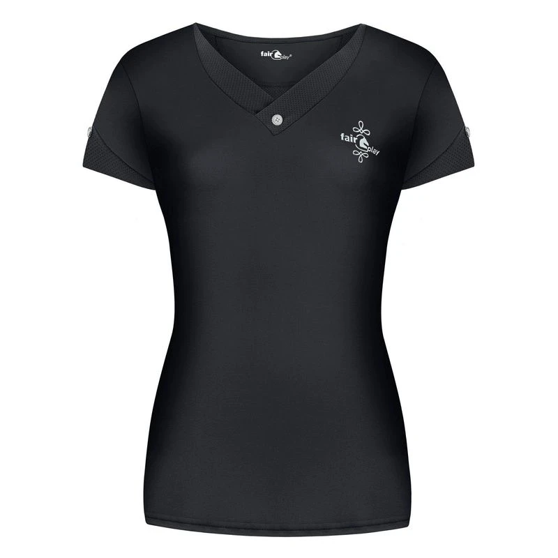 This sporty vee neck tee shirt is made of an ultra-light, breathable, quick-dry recycled fabric with UV protection. The back, neckline, and sleeve inserts are made of perforated knit for enhanced air circulation.