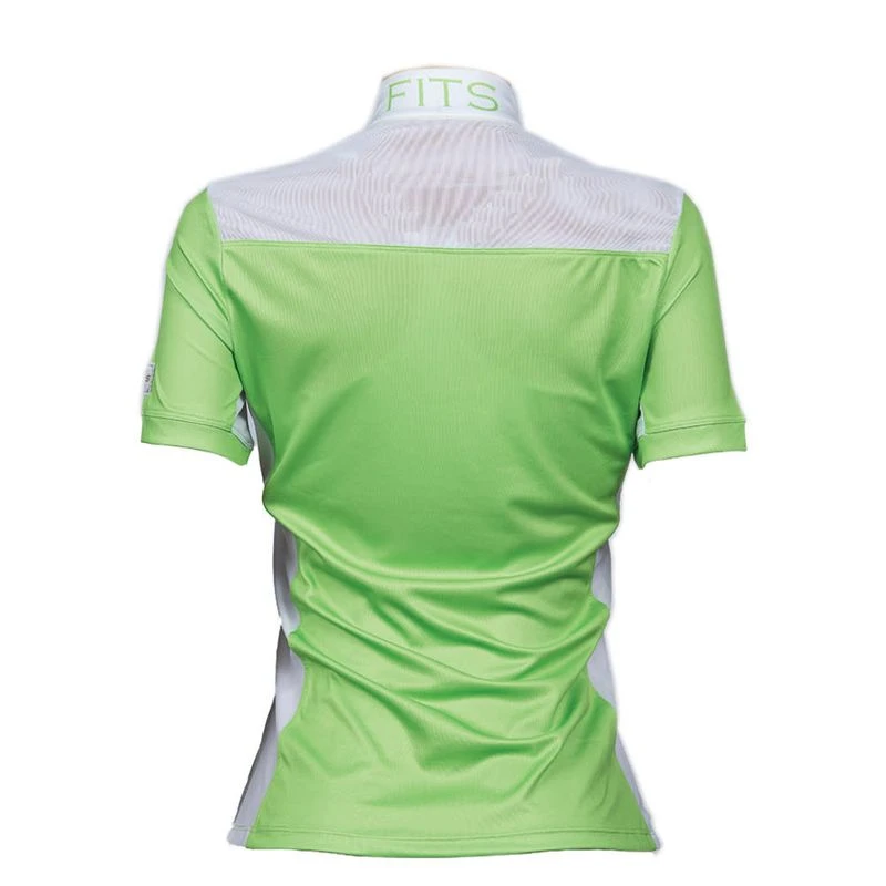 This ultra light tech top is perfect for schooling in hot weather with its moisture-wicking, antimicrobial fabric with UV protection. It features a quarter zip front front with contrasting patterned fabric inside the collar for a pop of fun and style. It features bold colorblocking with white accented sides with a flattering, fitted seam design. Power mesh undersleeves add a cool breeze of ventilation while riding.
