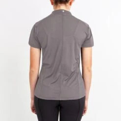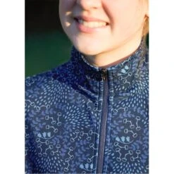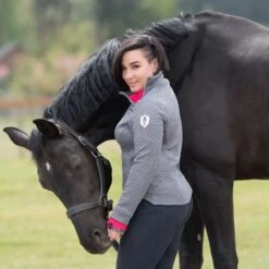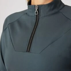 This shirt is made of AirLoft “stitch free” quilted fabric that provides unrestricted mover and lightweight breathable warmth. It has an asymmetrical neckline zip opening with a fun pop of color when open. The modern high/low hem provides full coverage in the saddle.